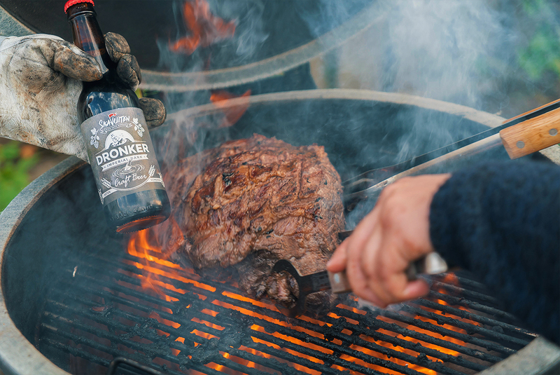 Brate das Fleisch mit der Fettschicht nach unten und direkt über dem Feuer an. Hier geht es noch nicht darum, das Fleisch zu garen, sondern darum, eine schöne Kruste zu erzeugen. Sobald die Fettschicht anfängt, ihre Arbeit zu tun, können Flammen entstehen. Das ist in Ordnung, solange das Fleisch nicht verbrennt. Wende das Stück regelmäßig, damit auch die Fleischseite angebraten wird. Sobald alle Teile eine schöne Kruste haben und angebraten sind, nimm das Stück vom Grill und lass es 10 Minuten in Alufolie ruhen.
