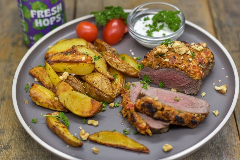Jetzt kann das Topping auf den Steaks verteilt werden. Die benötigte Garzeit ist von der dicke der Steaks stark abhängig. Das Steak sollte bei 2 Finger breite noch etwa 25-30 Minuten bei 100°C verweilen, bis eure Ziel-Kerntemperatur erreicht ist. Wir haben unsere Steaks bei 56°C (medium) entnommen und vor dem anschneiden noch kurz ruhen lassen. So kann sich der Fleischsaft wieder im kompletten Steak verteilen. Auf dem Teller zusammen mit den Kartoffelwedges anrichten.